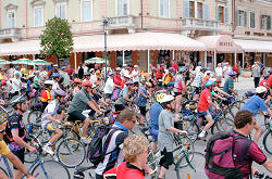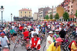 | Diesmal hatten die Veranstalter einen Platz im Hafen als Parkfläche für die Radler abgesperrt. Wo bekommt man so etwas noch geboten, Parkplatz direkt im Centrum am Hafen, die nächsten Restaurants nur wenige Meter entfernt und wer sich Zeit nahm Rovinj zu erkunden, den erwartete fantastisches. So z.B. auf der Spitze der Halbinsel die mächtige Domkirche Sv. Eufemja, die ab 1736 anstelle von zwei älteren Kirchbauten entstanden ist. Überragt wird die dreischiffige Barockkirche von ihrem schlanken, 60 m hohen Campanile, der höchste in Istrien, mit der Statue der hl.Euphemia an der Spitze. Vorbild für diesen Glockenturm war, wie könnte es anders sein, der Glockenturm von Venedig. Und das allerwichtigste an diesem Glockenturm, hat man die vielen maroden Stufen und die Angst davor erst einmal überwunden, bietet sich einem ein phantastsicher Ausblick über Rovinj. | |